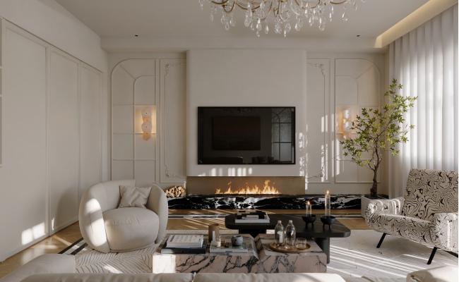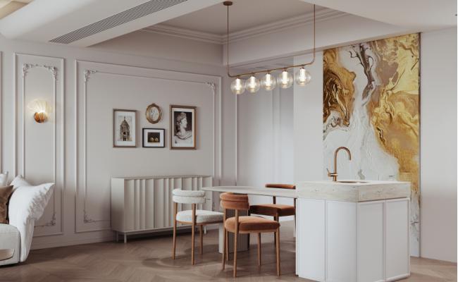 設計理念 輕法式風格以“減法美學”為核心,摒棄傳統法式的繁復雕花,通過對稱布局、淡雅色調和幾何線條傳遞優雅氣質。空間設計注重功能與美學的統一,例如客廳采用對稱式沙發布局,搭配弧形元素弱化線條的冷硬感,強化家庭互動性。材質選擇上,天然石材、絲絨與金屬的碰撞,既保留法式古典的厚重感,又賦予現代輕奢的精致氣息。 核心元素 ??石膏線條與拱形結構?:墻頂面通過雕花燈盤、石膏角花等細節營造法式儀式感,拱形壁龕設計可柔化空間邊界,增強視覺通透性。 ??色彩搭配?:以米白、奶咖等中性色為基底,局部點綴跳色,玄關采用莫蘭迪粉與奶油色拼接,既清新又顯高級。 ??材質碰撞?:天然大理石、絲絨沙發與黃銅燈具的組合,通過紋理對比提升空間層次;開放式廚房采用霧巖板黃銅結合櫥柜與小吧臺搭配,兼顧實用性與藝術感。 空間布局要點 ??功能分區?:采用玄關設置兩側對稱工藝玻璃,穿插活動空間;客廳與餐廳通過柔化護墻板貫通,增強動線流暢性。 ??視覺焦點營造?:通過局部亮點打破單調,例如電視墻采用圓弧形金屬擺放雕塑像,定主題格調提升;茶室搭配小圓角吊頂與不規則茶桌,形成趣味對比。 ??自然采光利用?:大平層需最大化利用270°寬景窗,客廳采用落地窗設計,搭配法式輕奢窗簾調節光線,營造溫暖氛圍。 細節處理 ??收納設計?:針對業主生活習慣,在玄關、臥室等區域設置整面墻衣柜,采用隱形嵌入式設計保持視覺整潔;主衛改造為四式分離,內帶獨立化妝間。 ??軟裝搭配?:家具選擇注重線條簡潔,弧形茶桌、無拉手柜體;裝飾畫、壁爐等元素延續法式浪漫,同時融入現代功能。