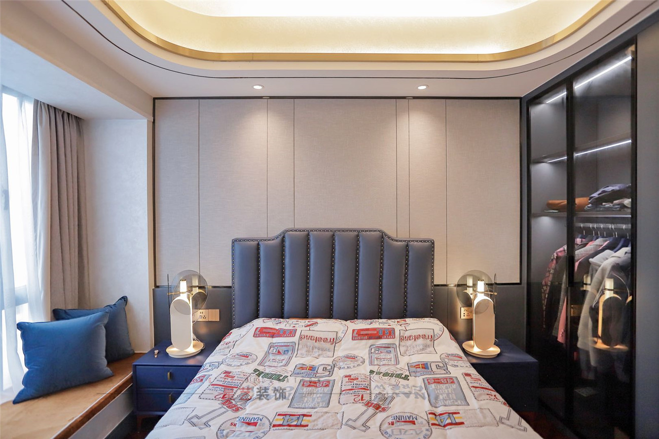 男孩房的實(shí)景中則是用了看藍(lán)色調(diào)做渲染,被子的英文海報(bào)圖案和設(shè)計(jì)干臺(tái)燈增加了臥室的潮流感,也有用到對(duì)稱的元素,大氣簡約。
