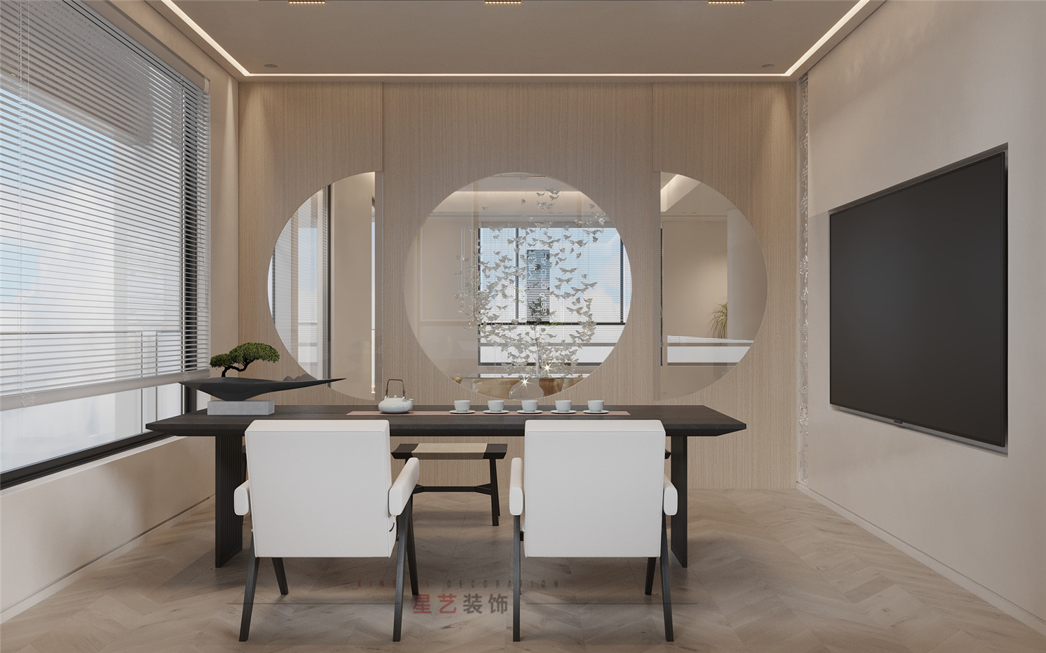 過道處設有衛生間,洗手臺,便捷舒適。墻體與玻璃門都有運用大面積枯山水紋路,詮釋深刻的禪宗美學,從而實現“無水而喻水”的效果,強化細節體現。